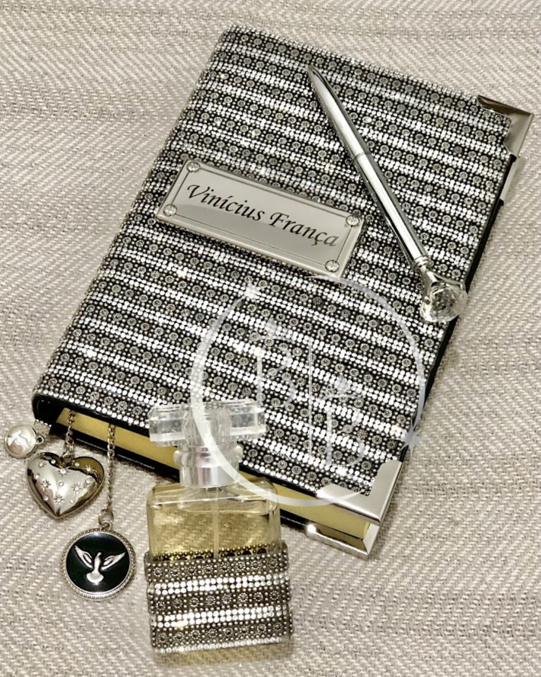 1 Bíblia Sagrada personalizada com nome gravado na plaquinha (dourada ou prata) com Capa em manta de pedrarias, feita à mão com brilho e elegância